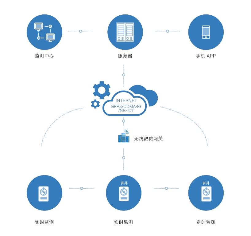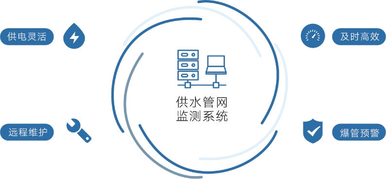 管網監測系統適用于供水企業遠程監測供水管網。供水調度人員在管網監測中心即可遠程監測全市供水管網的壓力及流量情況,同時具有水質監測功能以科學指揮各水廠啟停供水設備、保障供水壓力平衡和流量穩定、并及時發現和預測爆管事故。此外,該系統還可擴展管網末梢水質監測和閥門遠程控制功能。